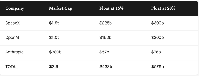 We’re about to witness three of the largest IPOs in history. SpaceX is targeting $1.5t. OpenAI aims for $1t. Anthropic is valued at $380b. Combined, $2.9t in market cap.