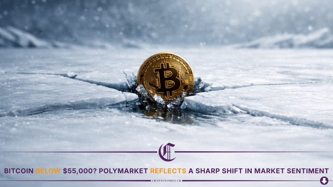 BITCOIN SENTIMENT TURNS SHARPLY BEARISH 📉 75% probability of $BTC falling below $55,000 on Polymarket 📊 Spot ETFs see five straight weeks of outflows 📉 Crypto market still down 45% from 2025 highs 🔍 Why it matters: Prediction markets reflect rising risk aversion, not just short-term noise. ❓ Are traders pricing reality — or fear? 👇 Read the full analysis. en.cryptonomist.ch/2026/02/23/...… #Bitcoin #CryptoMarkets #DigitalAssets #CryptoInsights #CryptoConversations