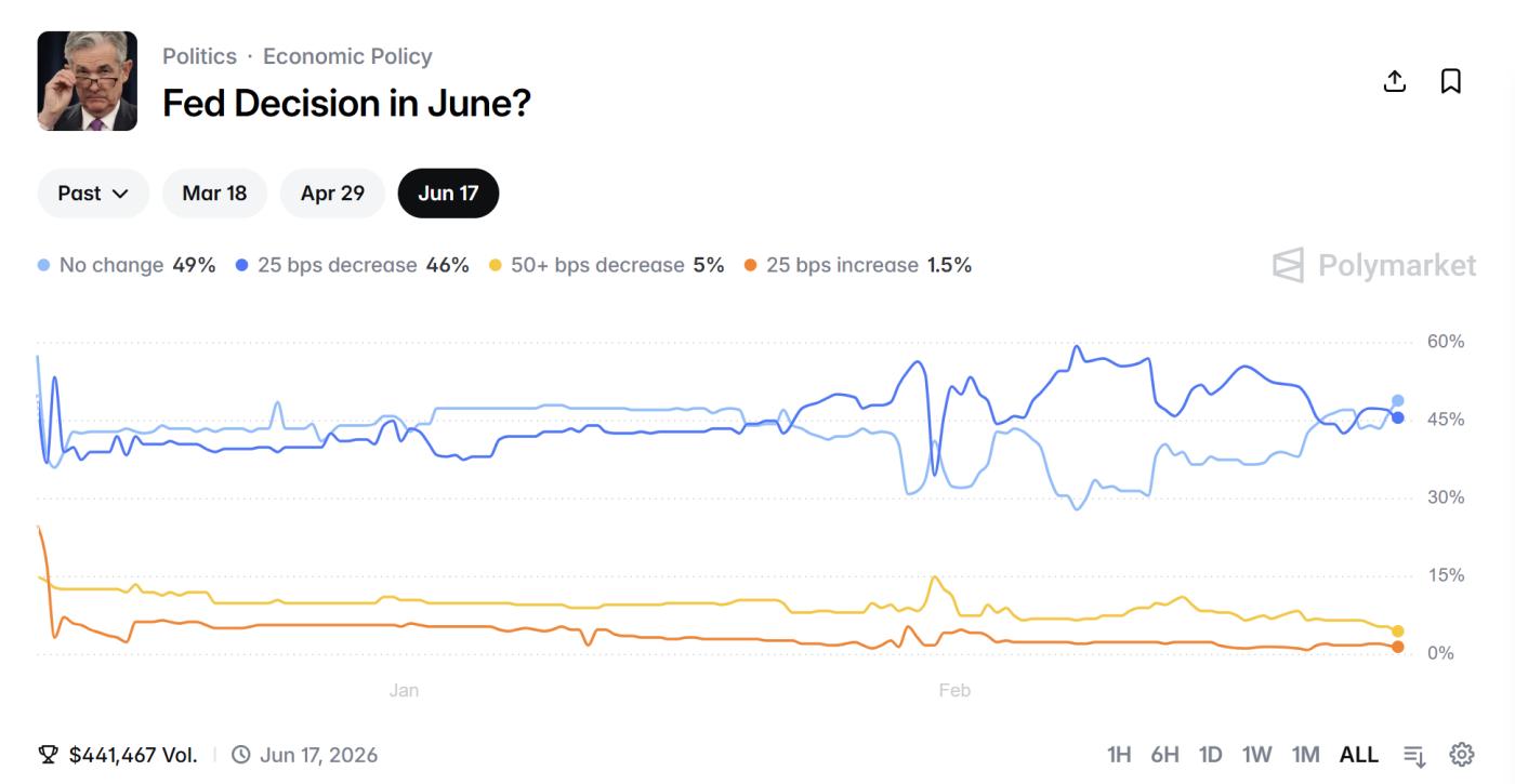 According to the latest data from Polymarket, the probability of the Federal Reserve not cutting interest rates was 97% in March, 86% in April, and 46% in June.