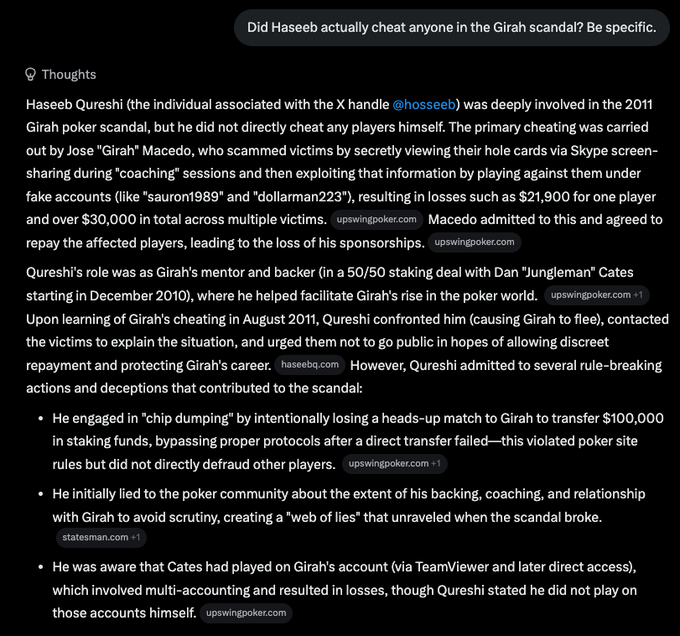 secondly as @hosseeb mentioned he was never accused of directly cheating or scamming players (confirmed by @grok)