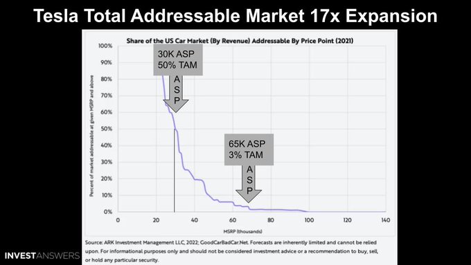 This chart is the perfect real-world example of price elasticity in action. Cut the price roughly in half (from about $65,000 to $30,000), and Tesla’s total potential market explodes by 16.6 times! We are seeing that impact of price cut from the new Cybertruck $59K Offer. Look at the graph: At the higher $65k average price, they could only reach the top 3% of the entire U.S. car market (the luxury buyers who can afford it). Drop the price to $30k, and suddenly they can go after 50% of the whole market. Bottom line: People already want Teslas. The real thing holding demand back isn’t desire — it’s simply whether they can afford one. Make it affordable, and the buyers show up in droves. h.t Ark for original chart