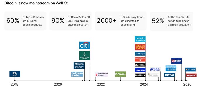 Bitcoin adoption on Wall Street is exploding! According to River's analysis: ✅ 60% of U.S. banks are preparing Bitcoin-linked financial products ✅ 90% of the top 50 RIA companies in Barron's ranking have a Bitcoin allocation ✅ More than 2,000 U.S. financial advisory firms have a Bitcoin ETF allocation ✅ 52% of the 25 largest U.S. investment funds have a Bitcoin allocation
