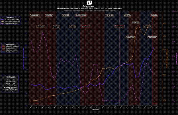 At a high level, it depicts the human cost of war, represented by the percentage of the US federal budget spent on Veterans Affairs (VA), the aggregate nominal level of federal spending, and the effective Fed Funds Rate. It is annotated with an illustrative, not exhaustive, list of US missile strikes or full-scale wars against Middle Eastern countries. As you can see, the cost to care for military personnel increased twice as fast as the federal budget, and most importantly to this essay, the Fed reduced the price of money right after a major Pax Americana initiated a Middle Eastern war of choice. As much as every US President that ruled during my lifetime tries to hoodwink the American public that their Middle East video game wars played out on evening television do not create misery for the only humans that matter in the Universe, American soldiers, the data clearly shows this obsession with military adventures in the Middle East destroys American lives in a costly manner.