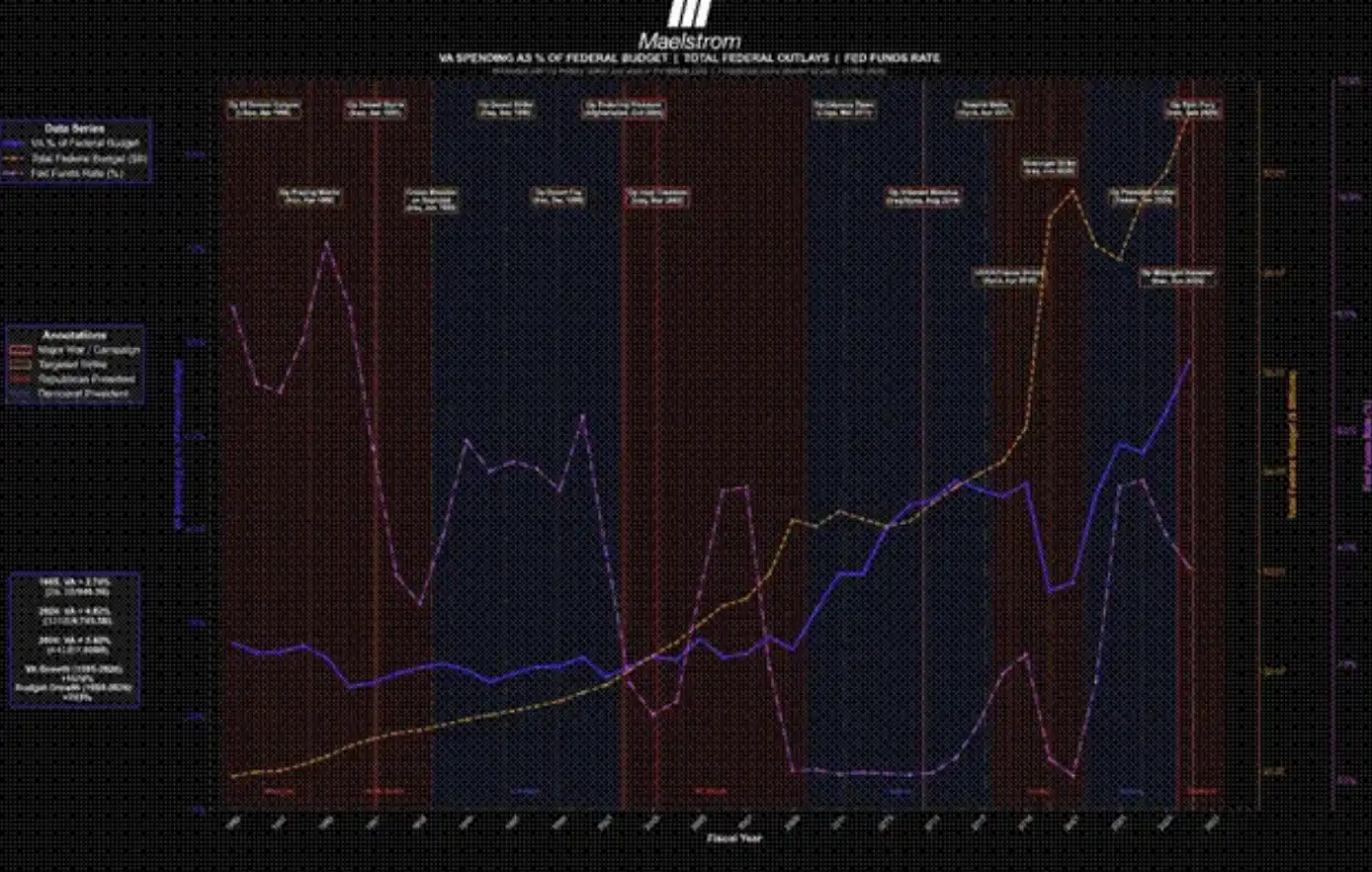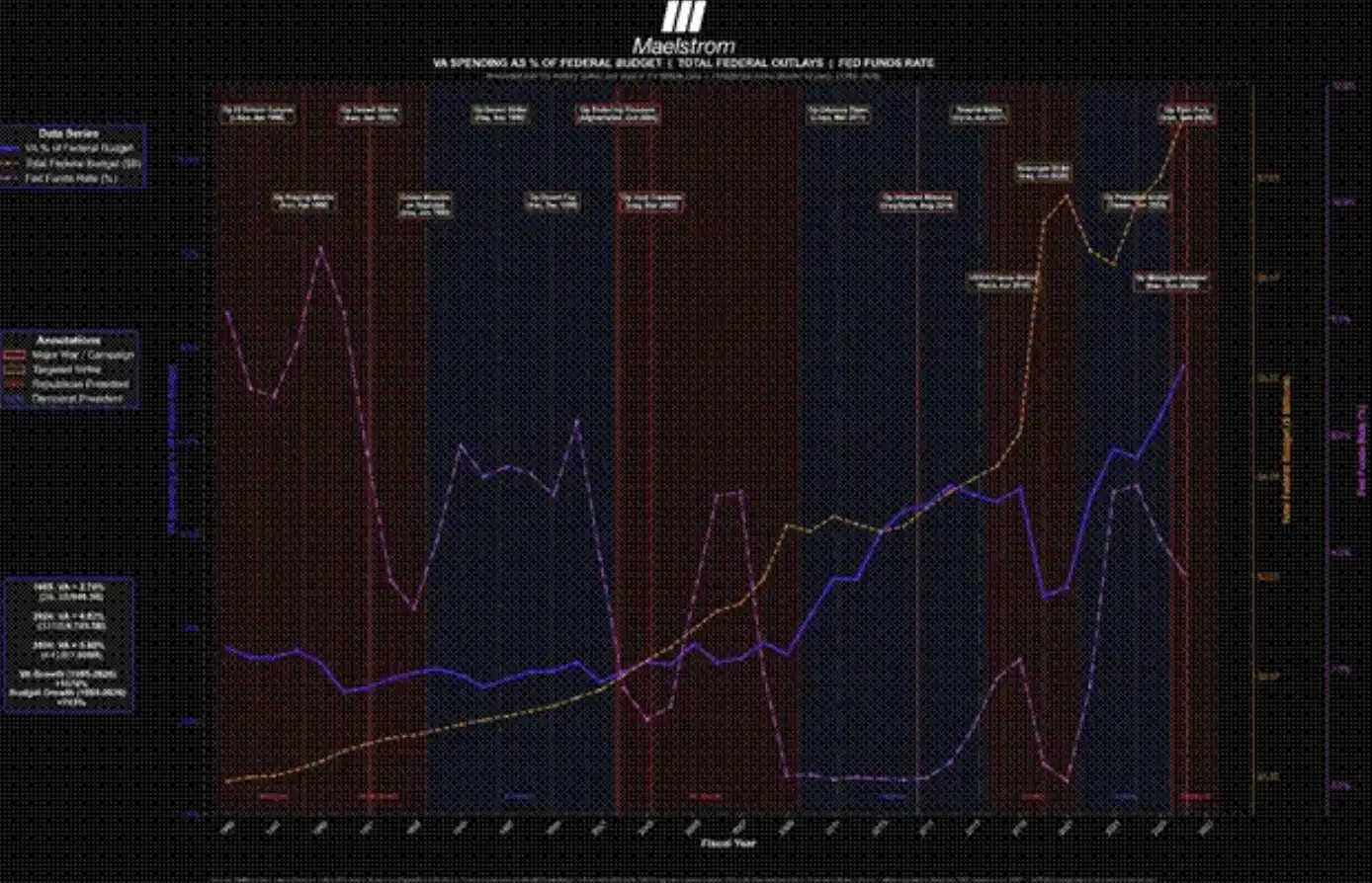 From a macro perspective, this chart attempts to illustrate the human costs of war. It centers on three key indicators: the percentage of the U.S. federal budget allocated to Veterans Affairs (VA), the total nominal federal government spending, and the effective federal funds rate. The chart also marks a series of representative (but not exhaustive) U.S. missile strikes or full-scale wars against Middle Eastern countries.