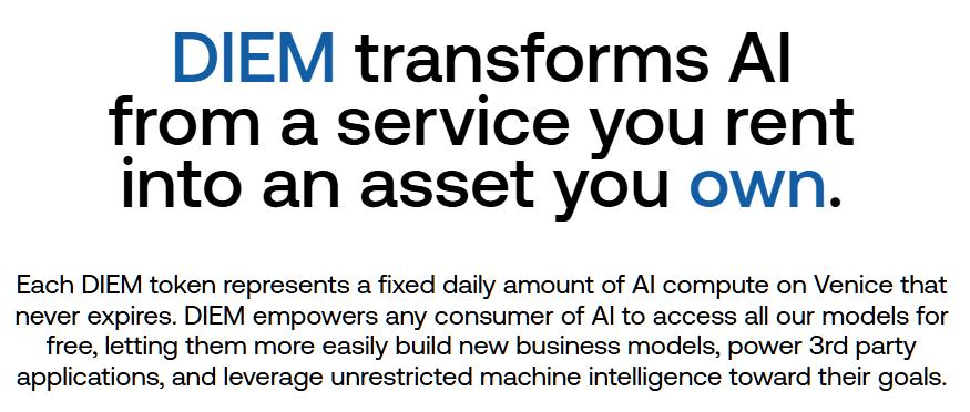 In August 2025, Venice introduced DIEM. This is where the tokenomics get genuinely exciting.