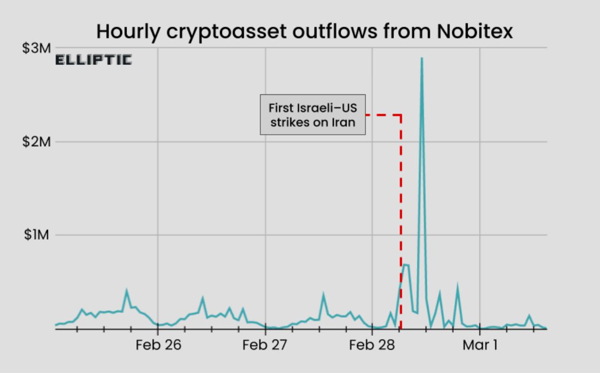 Within minutes of the US-Israeli airstrikes, outflows of crypto assets from Nobitex, Iran's largest crypto exchage, surged by 700%.