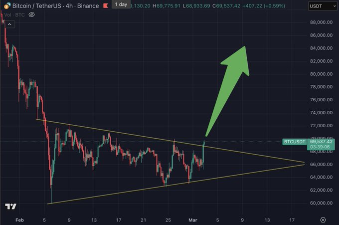 Bitcoin $BTC is breaking out of its wedge after weeks of compression. Descending resistance reclaimed, with a measured move targeting $82,000. This could kick off the next impulsive leg and resume the bull trend.