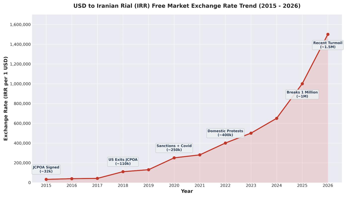 In 2015, after the Iran nuclear deal (JCPOA) was reached, the market initially expected a reduction in sanctions: at that time, the free market exchange rate was roughly 32,000 riyals to the US dollar. However, since the US withdrew from the JCPOA in 2018 and announced the phased reinstatement of sanctions, the riyal quickly fell from tens of thousands to the "hundred thousand riyals era" against the US dollar. Subsequently, the prolonged sanctions, coupled with inflation, tight foreign exchange supply, and geopolitical conflicts, caused the riyal to fall below the million riyal mark in the first half of last year. At the beginning of this year, when protests surged, it even fell to a historic low of 1.5 million riyals.