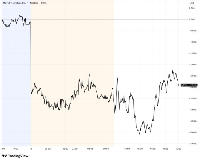 $MRVL is down ~3% into Thursday earnings as risk-off pressure outweighs a 39% YoY data-center surge and a reported $AMZN Trainium deal. Debate centers on Q4 guidance and $AMZN deal specifics as the key catalysts traders are watching into the print. Trade $MRVL volatility 24/7 with a Vest Capital funded account and access to up to $25k in trading capital.