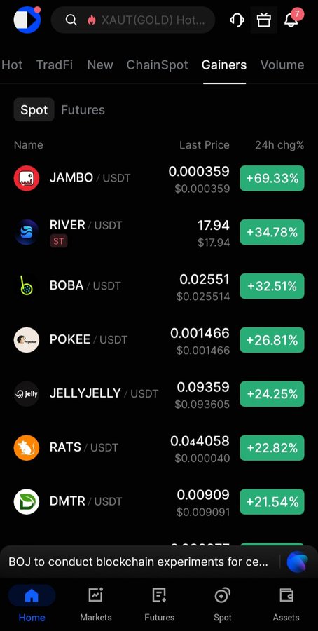 Geopolitical tension is rising, but the crypto market isn’t backing down. While majors consolidate, liquidity is rotating aggressively into small and mid-caps and volatility is expanding fast. BingX Spot Top Gainers: ✅ JAMBO/USDT +69.33% — $0.000359 ✅ RIVER/USDT +34.78% — $17.94 ✅ BOBA/USDT +32.51% — $0.02551 Clear momentum expansion across select alts. If this rotation sustains, short-term breakout setups could keep printing. Stay locked on the CEX for real-time market moves. #CryptoGainers #BingX