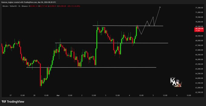 $BTC approaching key resistance near $69.5K โ a confirmed breakout could open the path toward new short-term highs.