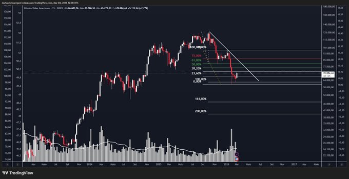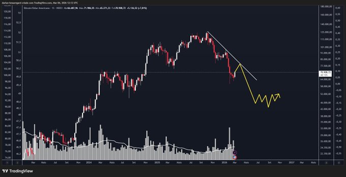 So, I believe we are in a bear market, and that we will have a few weeks of upside before the market continues to fall. The price should respect the downtrend line drawn on the chart, with a 50% retracement of the downtrend, in this case, a week-long uptrend, or a sideways movement which would be even worse. In the target projection, the final downtrend should be in the 50/40 area.