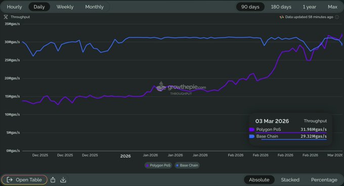 New throughput ATH for @0xPolygon PoS overtaking Base and currently leading the pack.