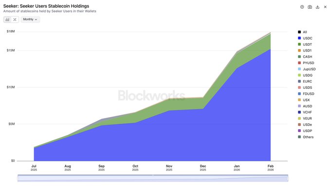 Seeker users continue to add to their stablecoin holdings. Their stablecoin holdings increased by 18% MoM from $14.9 million in January to $17.6 million by the end of February.
