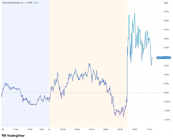 A 72% YoY USDC circulation surge, $11.9T in transaction volume, and a Strong Buy upgrade have $CRCL trading up ~2% on today's session. Traders focused on the Hana Card USDC Visa pilot in South Korea and Circle's Fed master account application under the skinny framework. Debate centers on whether USDC's payment expansion justifies $CRCL valuation against a negative net income profile.