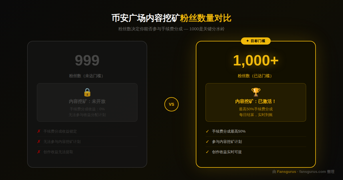 999 followers → 0% commission; Content mining locks in 1000 followers → Up to 50% commission, instant payment.