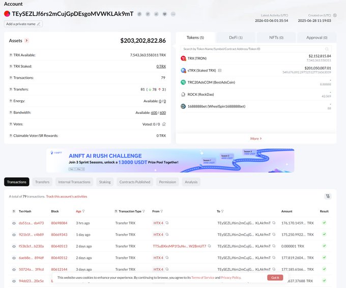 TRON Inc. (listed on NASDAQ: TRON ) continues to buy more TRX Token to increase its reserves. - Quantity purchased: 175,251 TRX - Medium price: $0.29/ TRX - Total transaction value: approximately $50,000 - Total TRX held by the company after the transaction: over 684.9 million TRX TRON Inc. is continuing to accumulate TRON ecosystem Token into its company reserves to demonstrate its confidence in the @trondao ecosystem. This wasn't the first transaction; previously, in January 2026, TRON Inc. purchased approximately 170,000 TRX at around $0.29. Following several rounds of purchases, total reserves have increased to over 684 million TRX. TRON Inc. is pursuing a long-term TRX accumulation strategy within Treasury, similar to a "crypto Treasury company" model. The purchase of 175,251 TRX is just one part of a chain of regular purchases aimed at strengthening shareholder confidence and value.