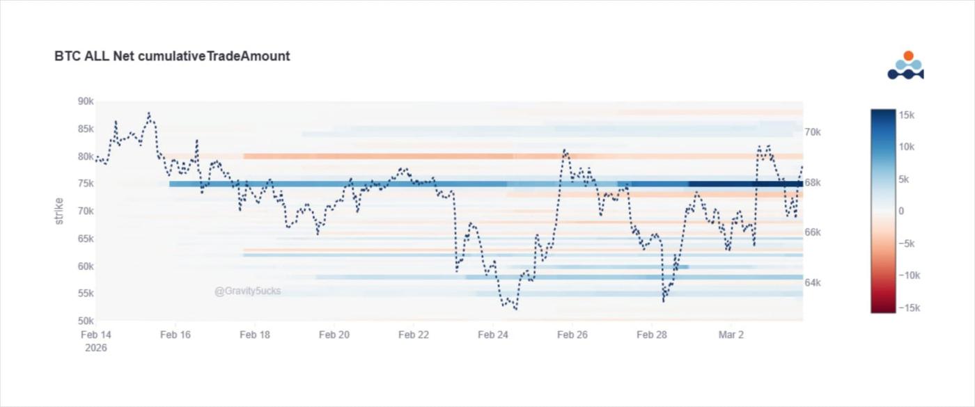 Put buying <60k, following on from large 20-40k purchases, and now Call buying at the 75k Strike demonstrate the main contributors.