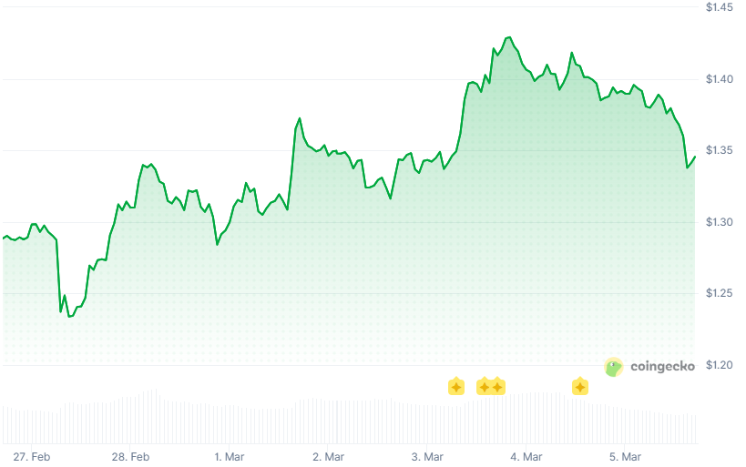 PancakeSwap’s CAKE token is down nearly 4% in the past 24 hours, but remains up 4% over the past week.