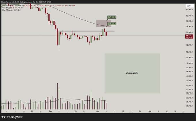 I missed the trade by a couple of cents and by being too precise with my entry. Even so, I'm waiting for a rebound to add to the short position. We've been analyzing this for some time: Bitcoin's main trend remains bearish. These movements could take us to the weekly accumulation zone between 55K and 40K. Patience. The market always presents new opportunities.