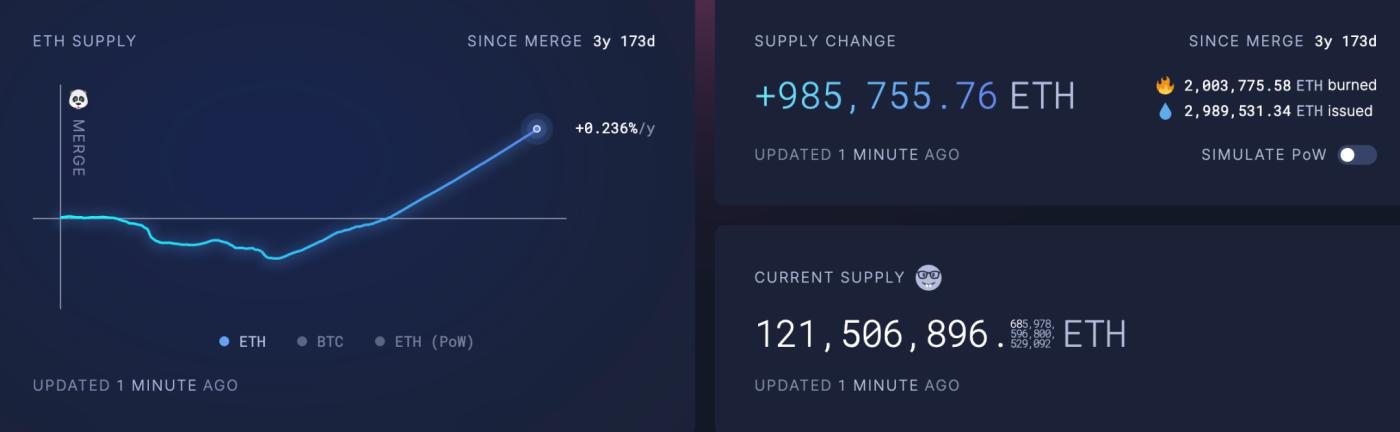 Currently, the ETH staking yield is around 3%, while the yield on the benchmark 10-year US Treasury bond is approximately 4.1%-4.2%. Meanwhile, Ethereum's annualized inflation rate over the past 30 days has exceeded 0.8%, and since the merger, the circulating supply of Ethereum has increased by nearly 1 million, compared to a minimum decrease of over 450,000. These figures are not optimistic.