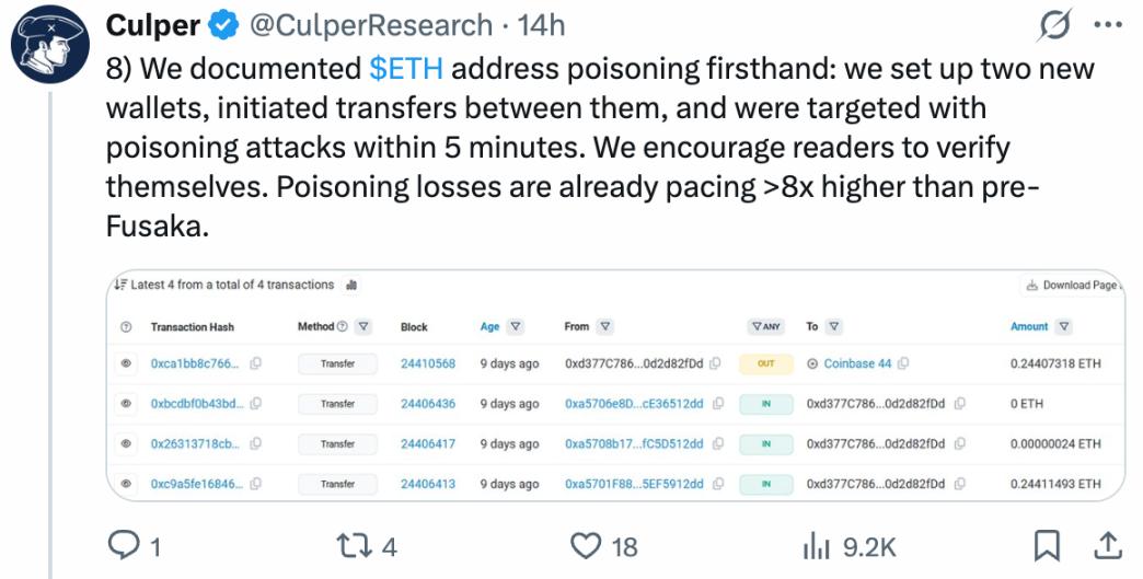 The collapse of this fee structure triggered a catastrophic chain reaction. According to Culper's analysis of full-chain transaction data from January 2025 to February 2026, address poisoning attacks (the kind of scam that transfers 0.0001 USDT to your wallet to trick you into copying the wrong address) saw explosive growth after the upgrade. Data shows that after the Fusaka upgrade, a staggering 22.5% of transactions on the Ethereum mainnet were actually due to address poisoning attacks; 95% of new wallet growth can be attributed to such fraudulent activities; and in the first two months of 2026 alone, the annualized losses from related scams were estimated at $348 million, more than eight times the level previously estimated.