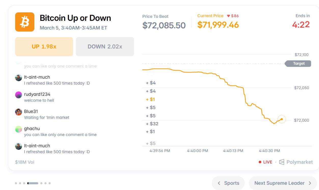 If you look closely, you'll notice that there are seven carousel slots. Popular or latest prediction markets are displayed in the carousel, including political and military topics, sports events, and even prediction markets like Bitcoin's 5-minute price fluctuation predictions, along with real-time commentary and betting amounts.