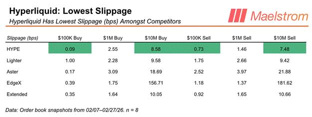 As you can see, executing size on Hyperliquid most times is the cheapest. Therefore, even if the headline taker fee is one or two basis points lower on a competing platform, real traders will still flock to Hyperliquid as they can trade in larger sizes with minimal market impact.