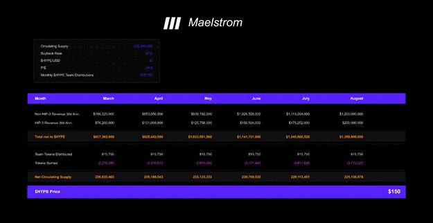 My model calls for an increase in revenues from HIP-3 and non-HIP-3 sources from a March total of $843m to an August total of $1.4bn. I will explain how Hyperliquid can regain its all-time high 30day annualized revenue run rate in the face of increased perp DEX competition. The last piece comes down to estimating how many $HYPE tokens the team will receive each month, using the past three months’ history of such transactions as a guide.