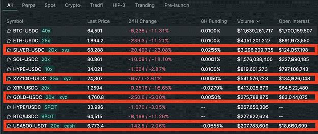 HIP-3 is the protocol that allows for permissionless listings of perps. If you stake 500,000 $HYPE tokens, you can create your own markets on whatever you like using the Hyperliquid matching and margining engine. TradeXYZ did just that, and their flagship products are perps on silver, gold, the Nasdaq 100, and the S&P 500. By the way, the silver and gold markets are less than three months old and are already trading hundreds, if not billions, of dollars per day. This is where price discovery will occur as the filthy fiat financial system changes the rules on the fly to smother the will of the people to be free of tyrannical statist money.
