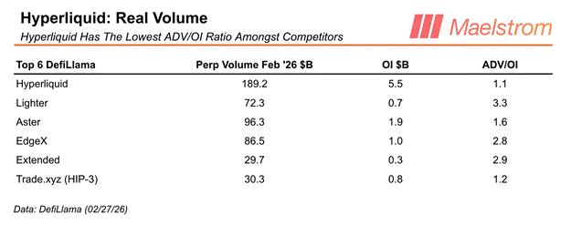 Volumizing and liquidity farming do not deepen ‌real liquidity. Assessing with certainty the percentage of trading volume attributable to these activities is impossible. The only objective measure to rank exchanges against one another is to calculate the ADV/OI ratio.[4] Because a trader must put up actual capital to margin an open position, OI tells us the degree to which real traders use the platform. ADV is easily inflated by volumizing and liquidity farming, but by deflating it by OI we arrive at a measure of organic volume driven by risk-taking traders. Therefore, the lower the ADV/OI ratio, the better.