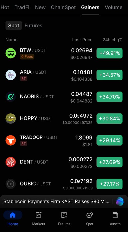 While the broader market consolidates, a few altcoins are rallying hard on BingX. Top gainers: $BTW leads with nearly 50%, while $NAORIS and $ARIA post strong double-digit gains. Looks like traders are rotating into low-cap utility plays on the CEX. #CryptoGainers #BingX