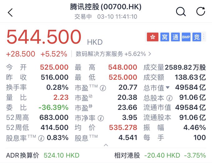 Pony Ma (Ma Huateng) is spreading his "Lobster Cult," launching Workbuddy (Openclaw) and generating buzz! $544.5 +28.5 + 5.52% (17.5X, 15.5X, 2026 and 2027 projected P/E ratios). His conservative AI strategy is gaining widespread acceptance! "The supreme martial arts master, Penguin 🐧 of Shenzhen, commands the world, none dare disobey! Without the lobster, who can compete?" Penguin 🐧 plus lobster 🦞, leading the pack! (Not investment advice, DYOR)