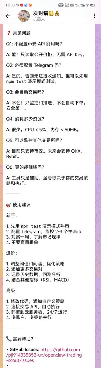 💻 技术:OpenClaw + 币安 API + Telegram