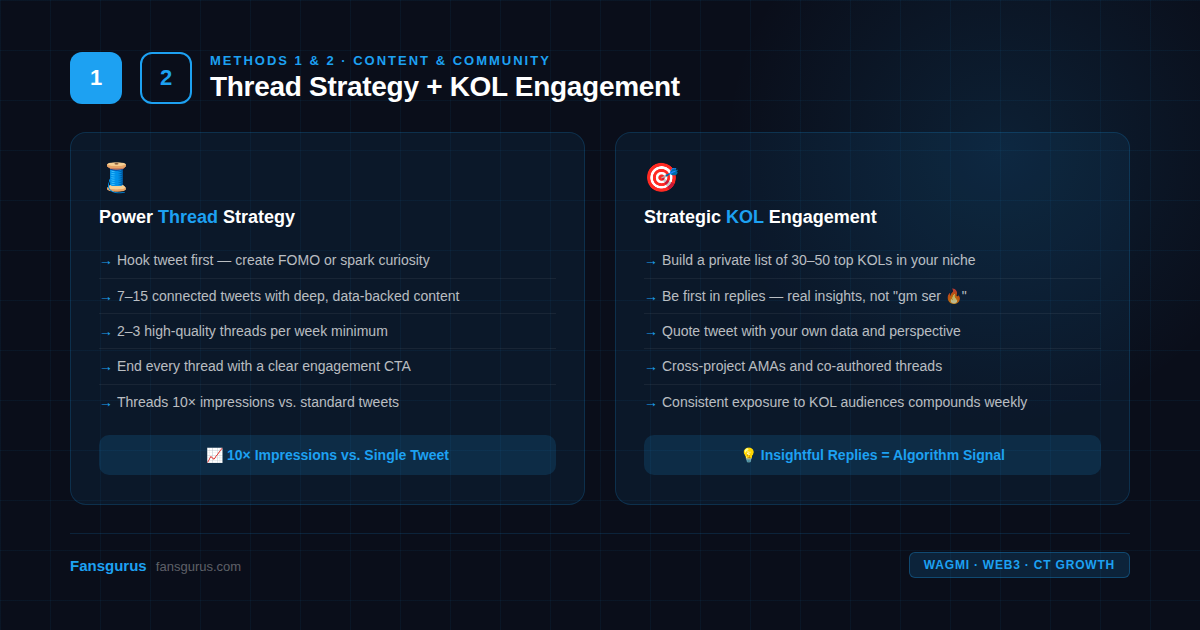 In CT, threads are the ultimate authority-building tool. A well-crafted thread on a topic like "Why zkEVM is the endgame for scalability" or "Our onchain data surprised us — here's what we found" can get 10x the impressions of a standard tweet and pull in hundreds of targeted followers in a single day.