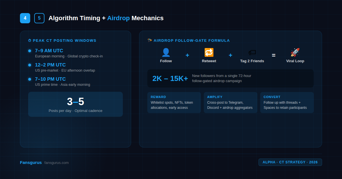 Few tactics accelerate Twitter follower growth faster than a well-designed airdrop campaign with a follow requirement. This is a core part of the CT playbook because it aligns incentives perfectly: users want tokens, projects want followers — and the follow gate creates a natural funnel.