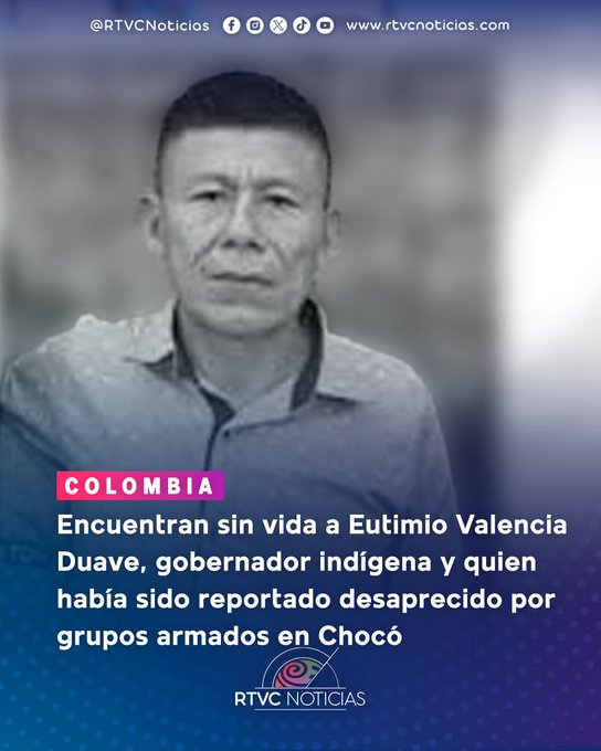 ATTENTION 🚨: The body of Indigenous Governor Eutimio Valencia Duave, leader of the Alto Tarena community, who was reported missing in Chocó by armed groups, has been found. "We urgently call on the competent authorities to expedite the necessary investigations to clarify what happened and determine the corresponding responsibilities. We cannot allow this fact to remain unpunished," the Association stated in a press release. Indigenous councils and traditional authorities of the Emberá Dóbida, Katío, Chamí, and Tule communities of the Chocó department (Orewa) expressed their sorrow upon hearing this news. More details in our #RTVCNoticias broadcast: rtvcnoticias.com/senal-en-vivo