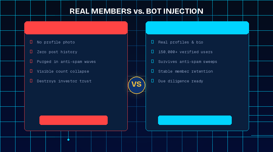 Bot-based member services inject fake accounts that inflate your counter but produce zero engagement. Worse, Telegram's anti-spam systems have become significantly more aggressive in 2024 and 2025. When bot accounts get flagged and purged — and they do get purged, often in waves — your member count drops by thousands overnight, publicly. That visible collapse is one of the most damaging things that can happen to a project in its growth phase. It signals to every watching investor that your numbers were manufactured. CT does not forget.