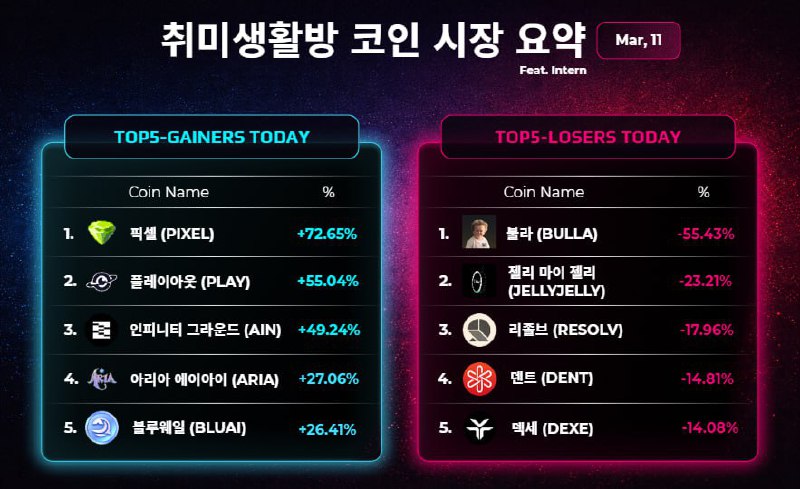 📊Overall Coin Market Summary (2026.03.11) As of today, we've compiled the top and bottom coins by daily volatility. Coins with significant short-term price movements are highlighted, demonstrating both upward and downward trends. 🚀 Top 5 Daily Gains 🥇 PIXEL +72.65% / Current Price $0.00878 🥈 PLAYOUT +55.04% / Current Price $0.0348 🥉 INFINITY GROUND (AIN) +49.24% / Current Price $0.0534 4️⃣ ARIA (ARIA) +27.06% / Current Price $0.1281 5️⃣ BLUE WHALE (BLUAI) +26.41% / Current Price $0.00642 📉 Top 5 Daily Losses 🥇 BULLA -55.43% / Current Price $0.0101 🥈 JELLY MY JELLY (JELLYJELLY) Change -23.21% / Current Price $0.0542 🥉 RESOLV (RESOLV) Change -17.96% / Current Price $0.1073 4️⃣ DENT (DENT) Change -14.81% / Current Price $0.000230 5️⃣ DEXE (DEXE) Change -14.08% / Current Price $4.4110 🎯 One-Line Summary & Checkpoints 🟢 Check rising and falling stocks based on 1-day price fluctuations 🟢 Monitor stocks with significant short-term price fluctuations 🟢 Continued differential movements based on supply and demand for each stock This article was written by MyHobby_Intern. #Cryptalk #OverallCoinMarket #1DayUp #Overbought #Oversold #ChwiSaengBang