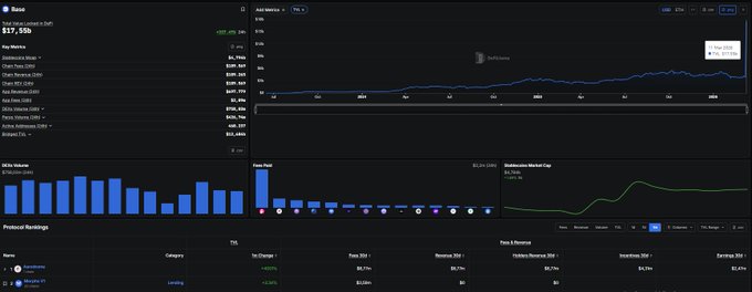 🚨 BREAKING: Base TVL just hit $17.55B on DeFiLlama - up +337% in the last 24h. Base is cooking again.