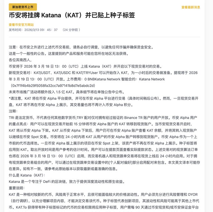 $KAT Source: cache.bwe-ws.com/bn-1065 Binance will list Katana (KAT) on March 18, 2026 at 21:00 (UTC+8) and open the following spot trading pairs: KAT/USDT, KAT/USDC, KAT/TRY. Seed tags will be applied to KAT.