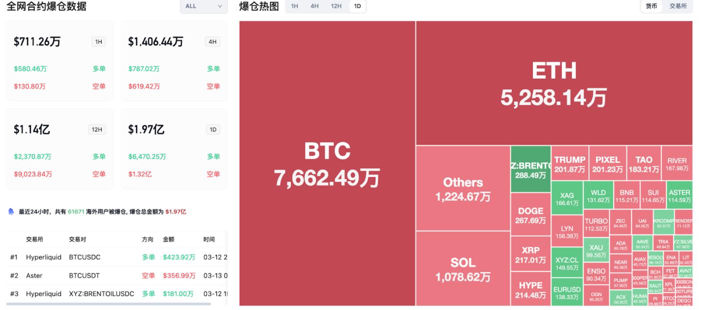 24-hour liquidation data: A total of 61,671 people worldwide were liquidated, with a total liquidation amount of $197 million, including $76.62 million in BTC liquidations, $52.58 million in ETH liquidations, and $10.78 million in SOL liquidations.