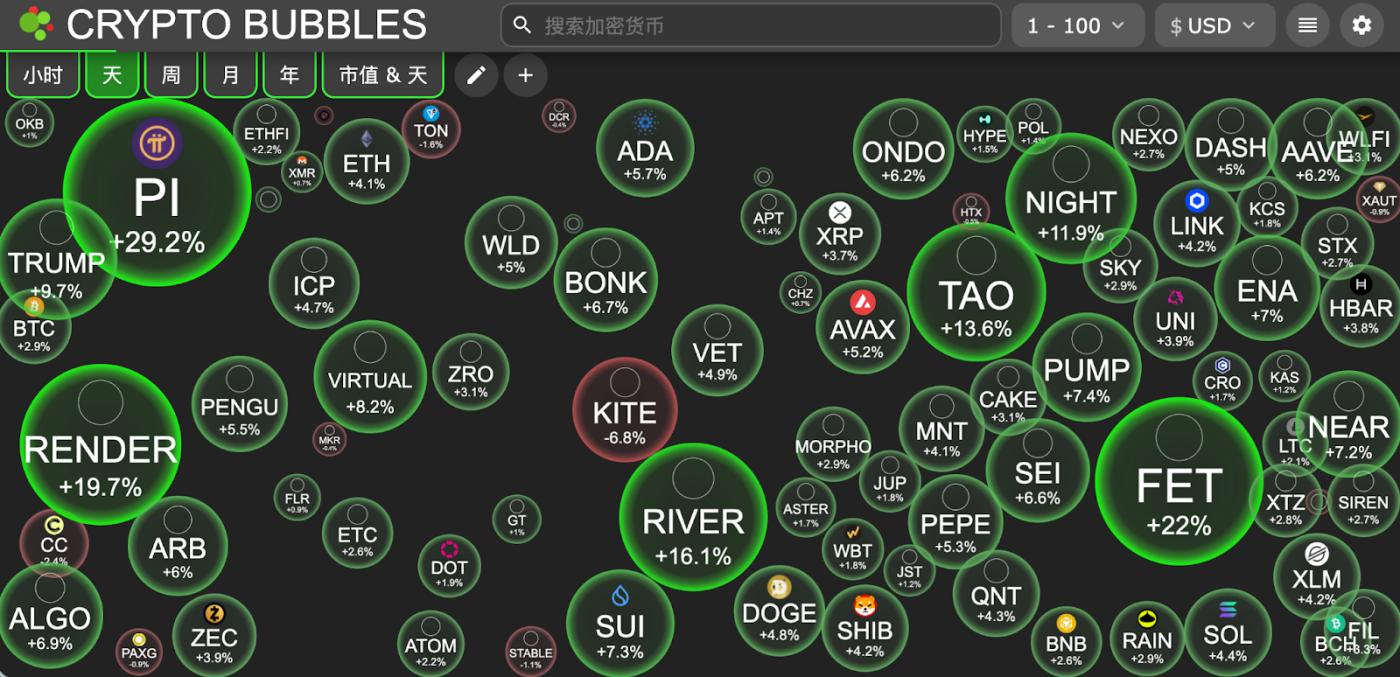 The top 100 cryptocurrencies by market capitalization with the largest gains today are: Pi Network (up 29.7%), ASI Alliance (up 22.6%), Render (up 20.1%), River (up 17.3%), and Bittensor (up 14%).