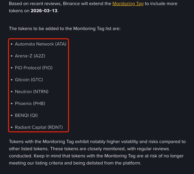 Binance announced it will add Monitoring Tags to eight tokens — ATA, A2Z, FIO, GTC, NTRN, PHB, QI, and RDNT — on March 13, 2026. Tokens with this tag are considered higher risk and subject to closer review, and users must pass a risk-awareness quiz every 90 days to continue trading them.