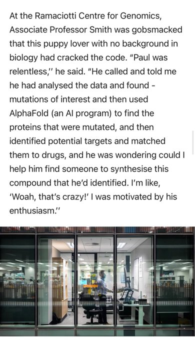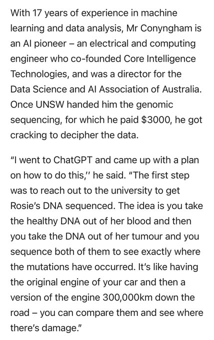 This is wild. https://theaustralian.com.au/business/technology/tech-boss-uses-ai-and-chatgpt-to-create-cancer-vaccine-for-his-dying-dog/news-story/292a21bcbe93efa17810bfcfcdfadbf7…