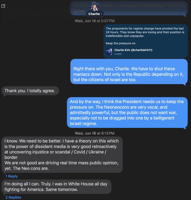On June 18th, I had a text exchange with Charlie Kirk. He said he was spending two full days at the White House trying to persuade President Trump not to initiate a war with Iran.