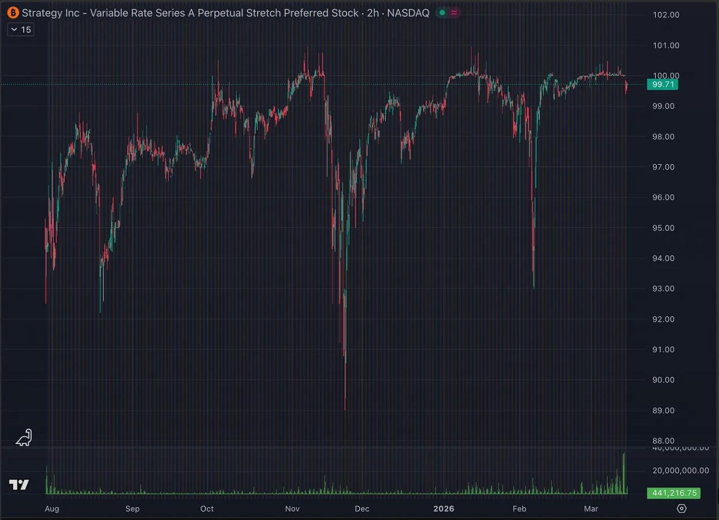 This means that when the price is below $100, all trading volume consists of STRC shares being traded among past, present, and new holders. When the price reaches $100, some trading volume still corresponds to ordinary STRC share trading (because there are also people willing to sell at $100), but the remaining trading volume corresponds to Saylor issuing new shares and selling them to "excess demand" at $100.