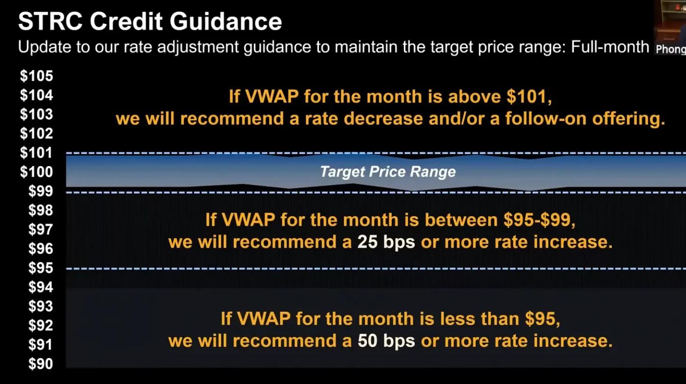 Strategy's current guidance is as follows: if the monthly VWAP (volume-weighted average price) of STRC is between $95 and $99, they will increase the dividend yield by 25 basis points (bps); if the monthly VWAP is below $95, they will increase it by 50 basis points; and if the monthly VWAP is above $101, they will decrease the dividend yield.