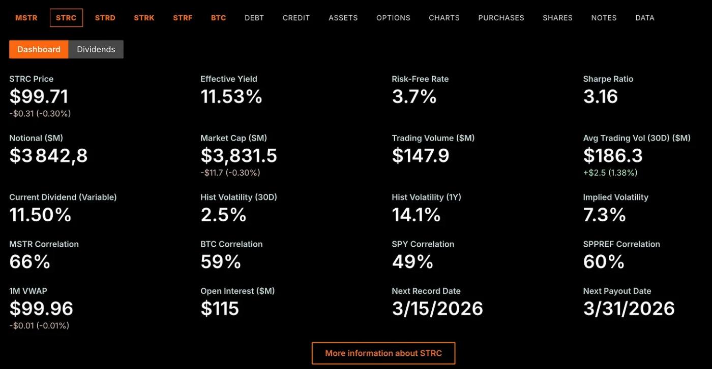 Odaily Note: All data for STRC can be found on Strategy.com. The screenshot below is from March 13, 2026, which is the ex-dividend date, so the price of STRC will be lower than its face value.