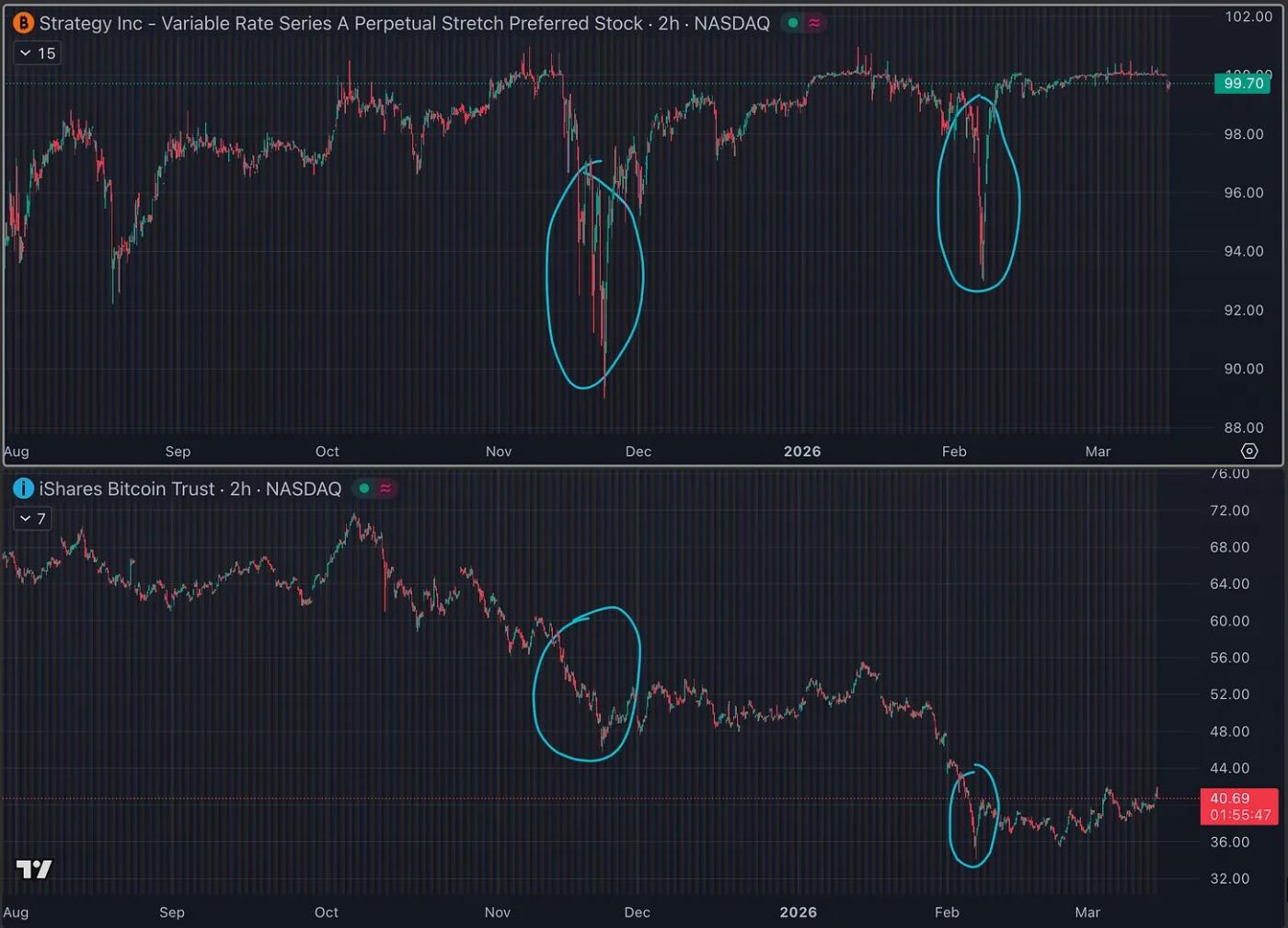 Odaily Note: The biggest drops in IBIT (BlackRock Bitcoin ETF) have often been accompanied by drops in STRC.